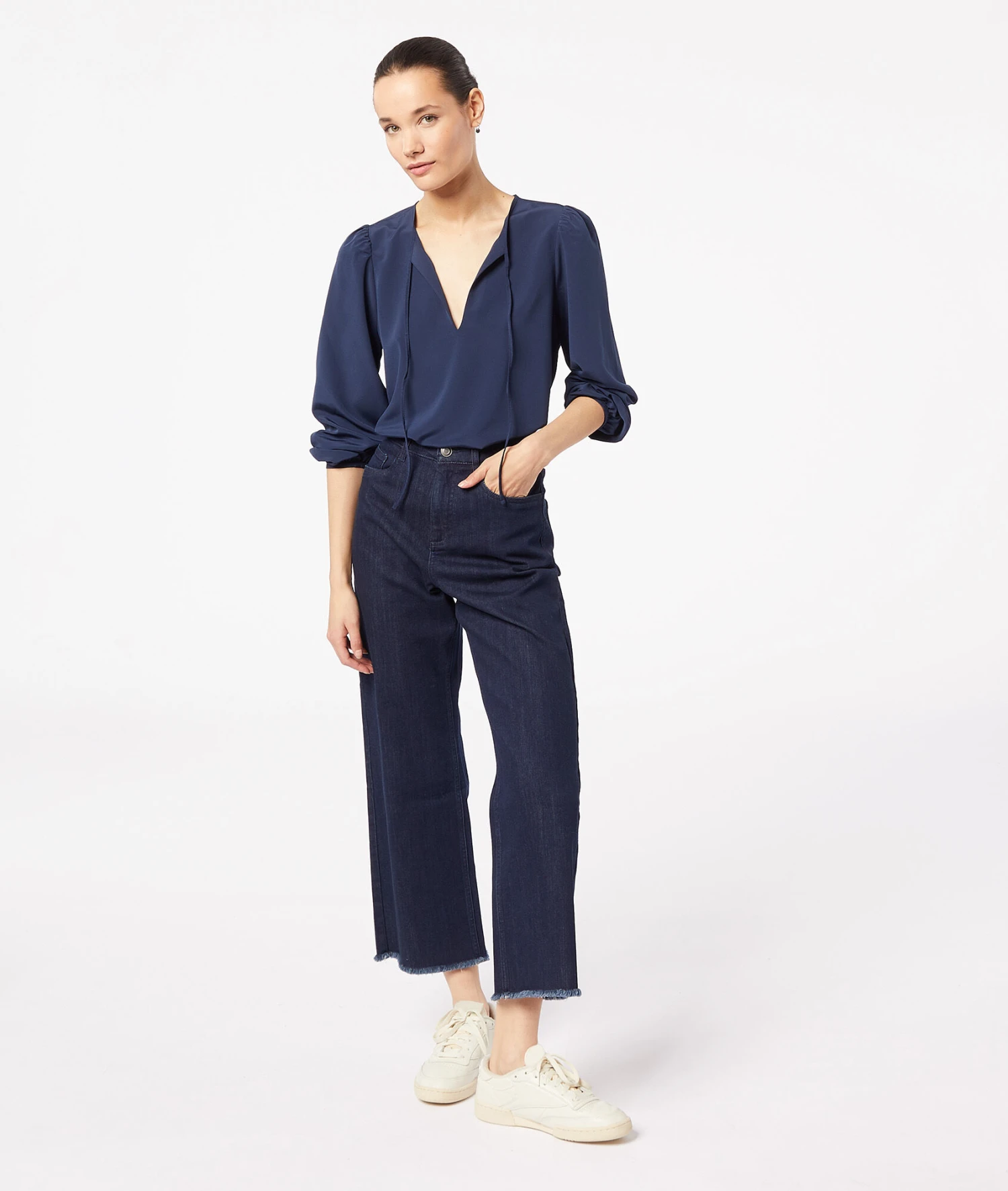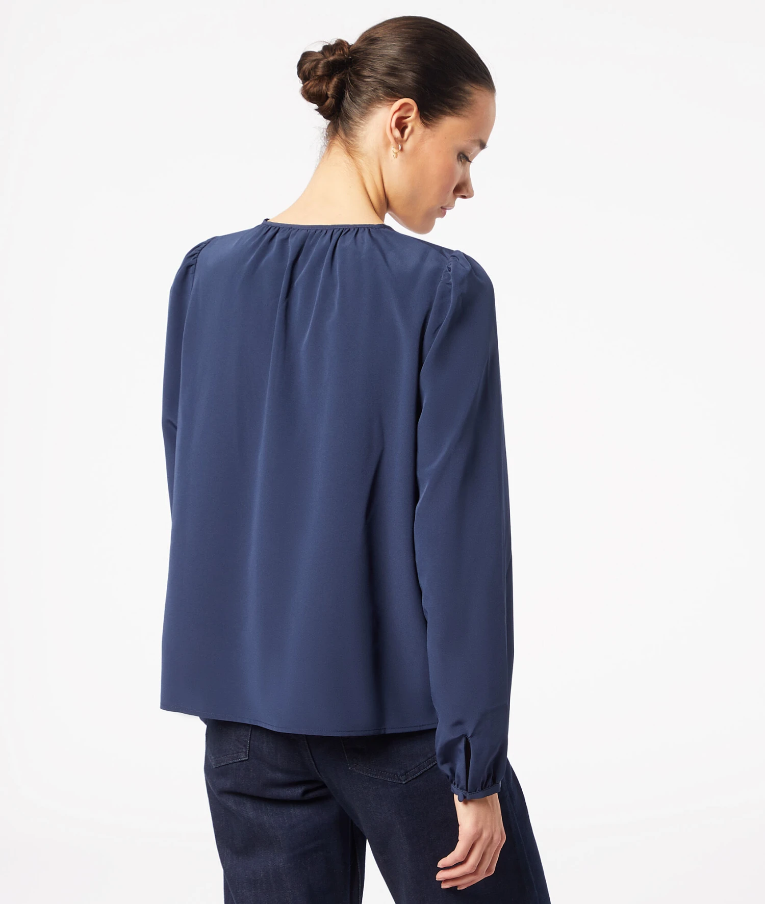 Légère et élégante, cette blouse ample à manches longues laisse apparaître un décolleté en V muni de liens. .