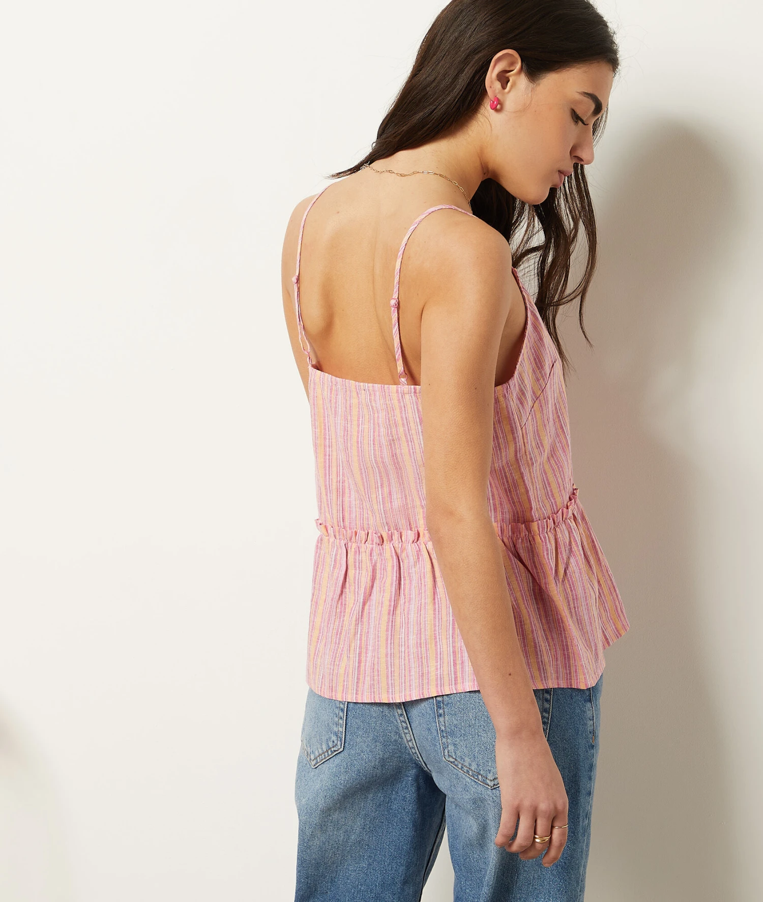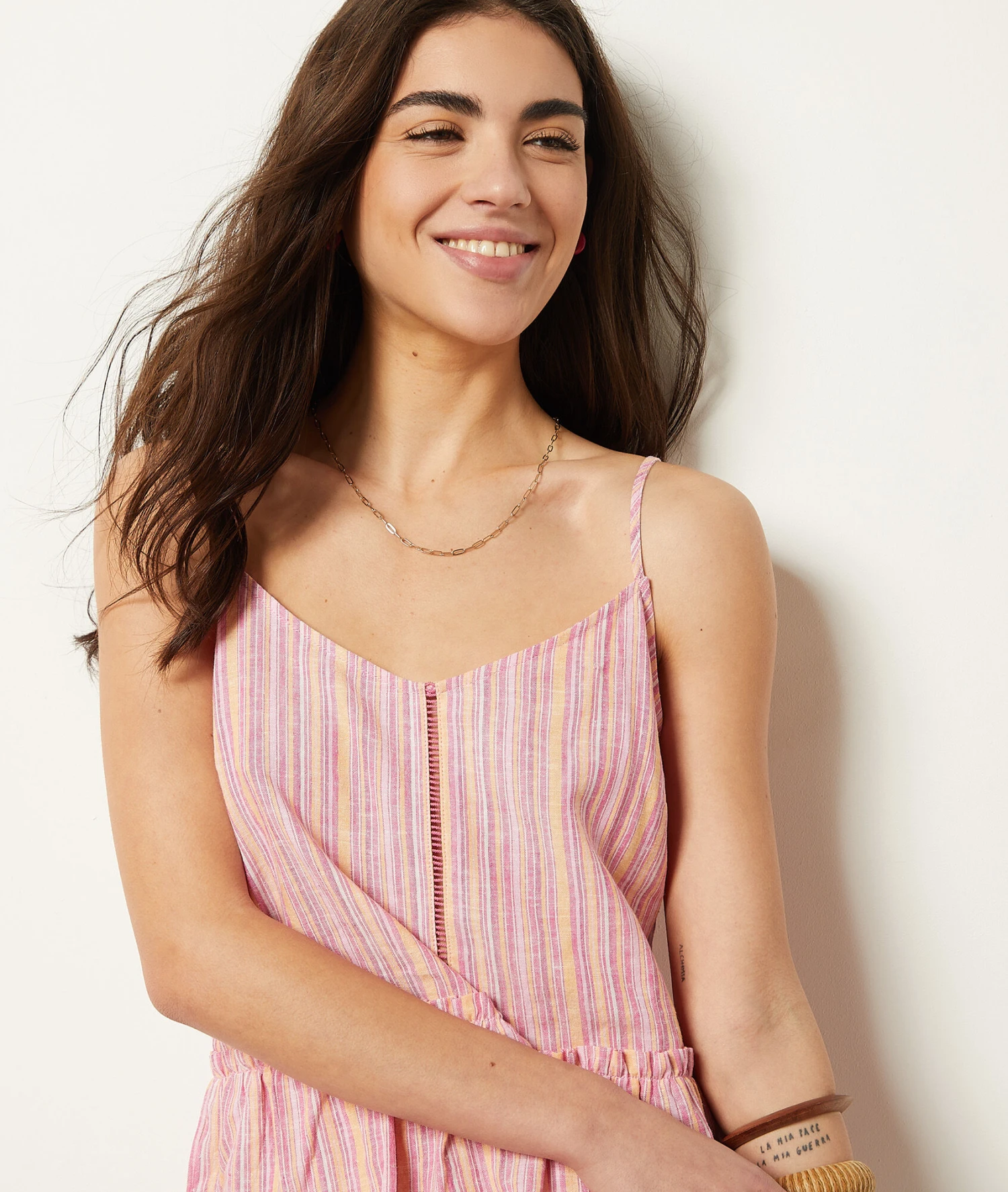 Craquez pour la féminité des détails et le motif rayé de ce débardeur. Il dévoile un sublime col V et des bretelles fines. Associez-le à un short ou à un jean pour un outfit de mi-saison léger et tendance.