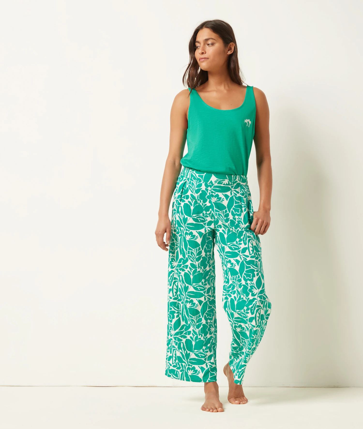 Une jolie broderie en forme de palmier se dessine sur ce haut de pyjama et invite l’été dans votre vestiaire de nuit. Sans manches, il dévoile un col rond et une matière en jersey de coton pour des nuits douces et légères.