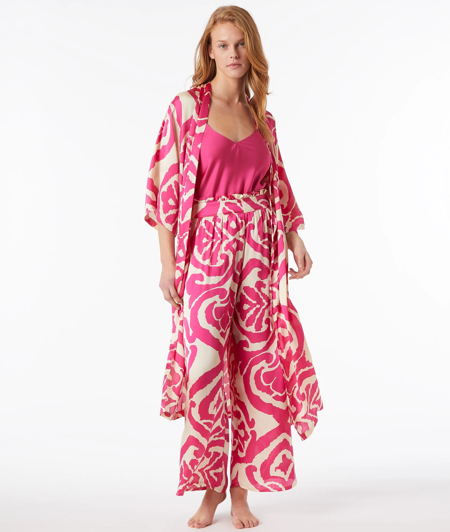 L’imprimé phare de la collection se dévoile sur ce déshabillé satiné aux nuances acidulées. Muni d’une ceinture amovible à la taille, il se pose sur le pyjama coordonné pour cocooner avec élégance.