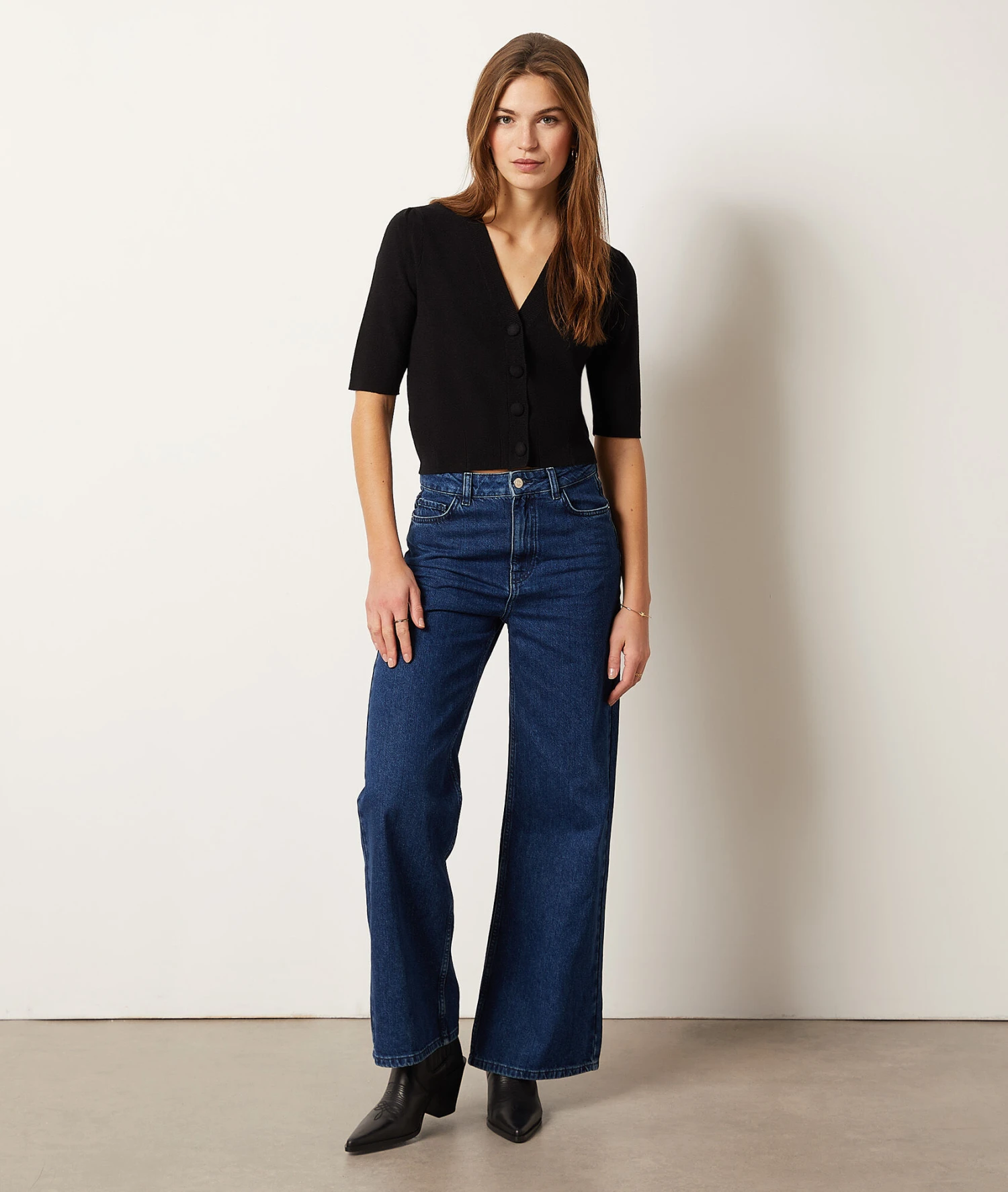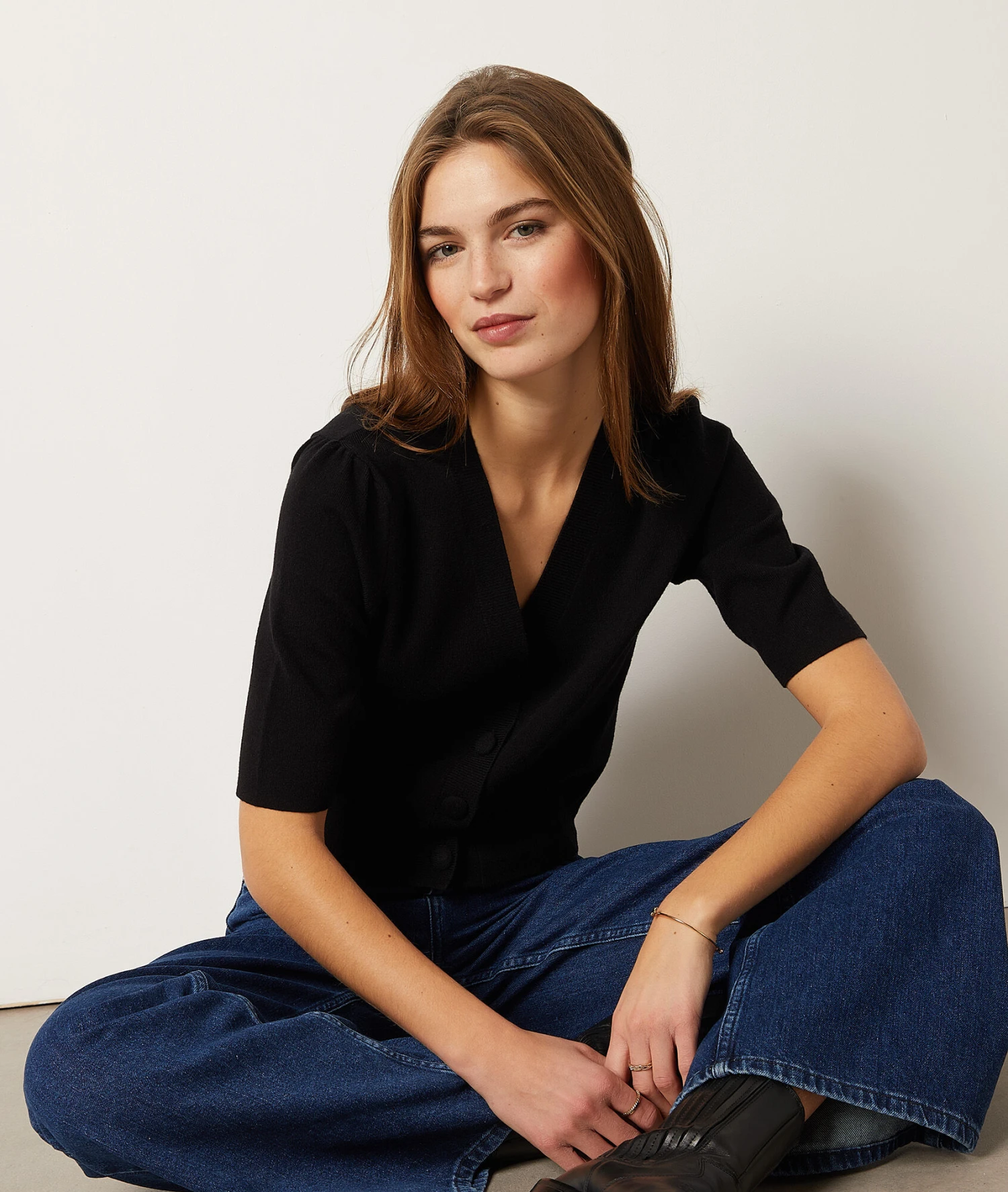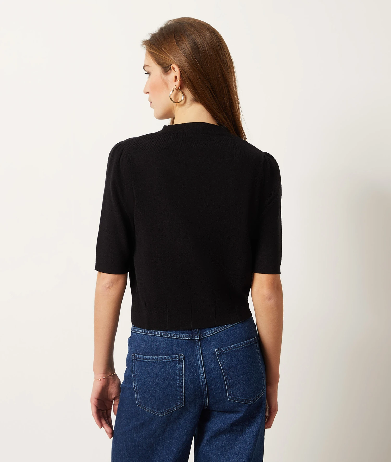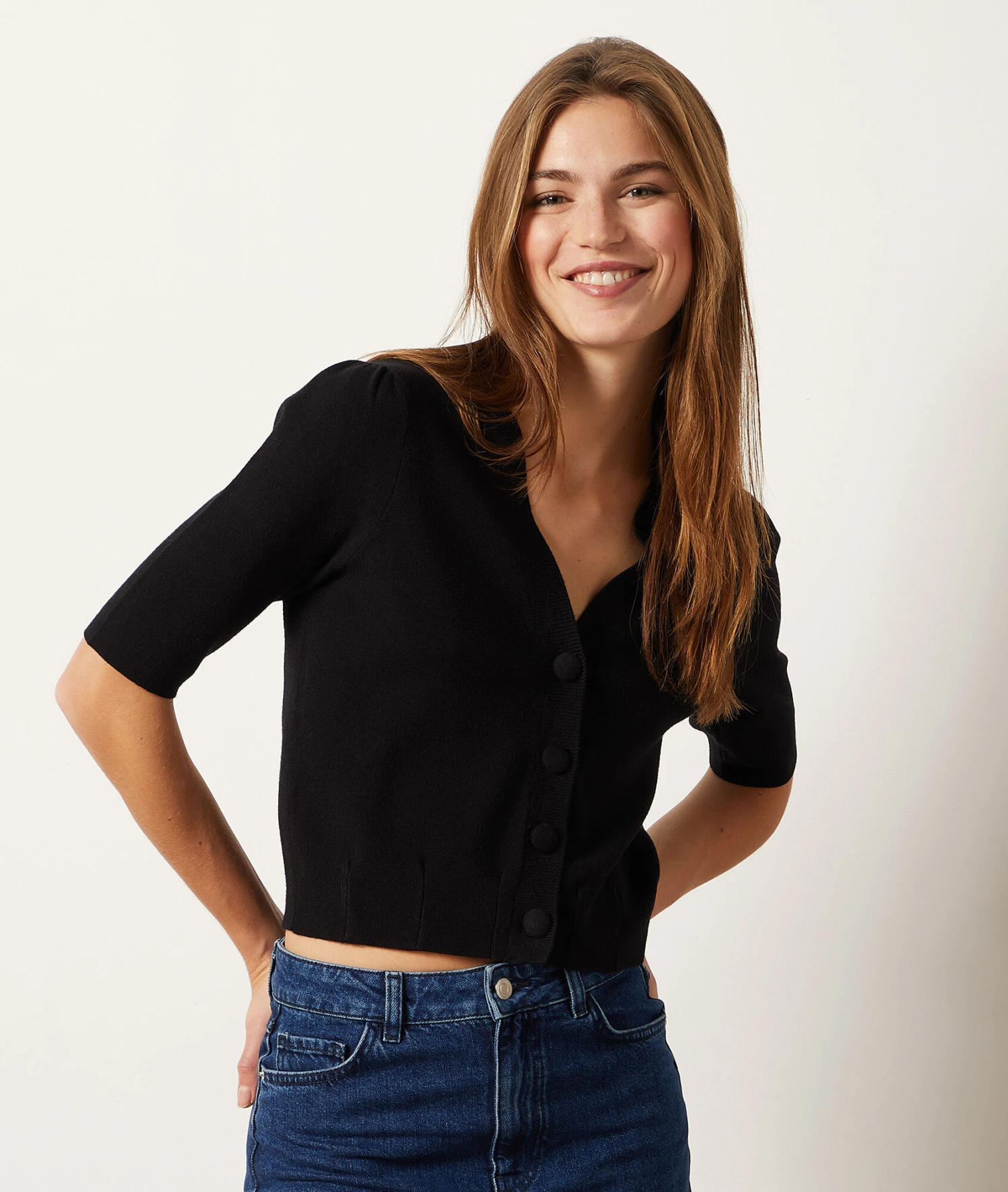 Adoptez un style casual chic avec ce gilet en maille. Dévoilant un décolleté en V et des manches trois quarts, cet intemporel s’associe à un jean coupe flare pour un look tendance et élégant.