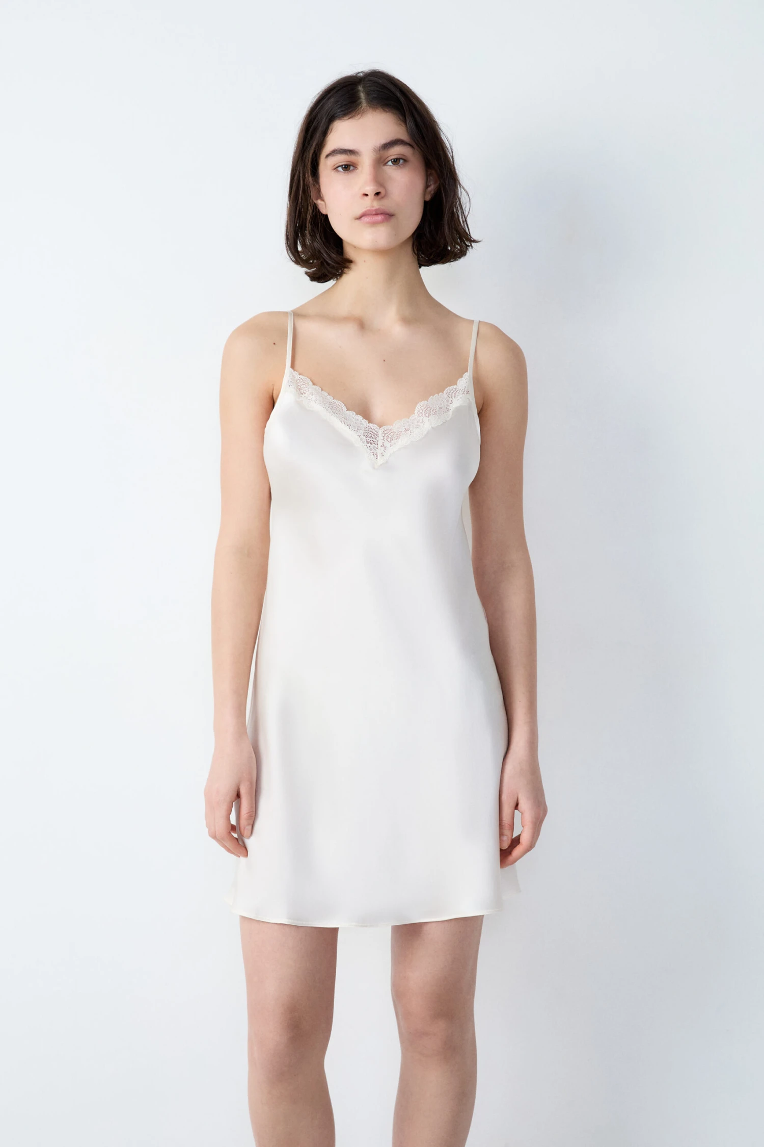 Une nuisette divine rehaussée de dentelle fleurie, à porter la nuit, mais aussi le jour sous un maxi gilet en maille.
