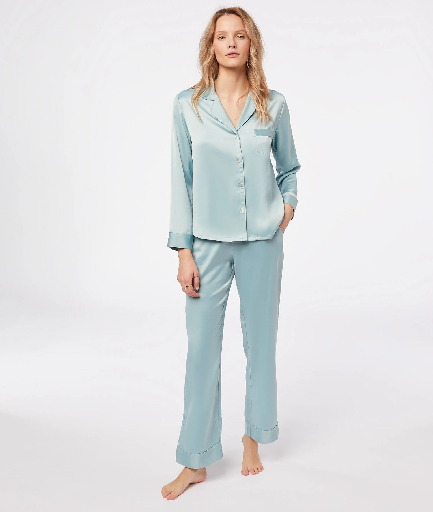 Chic et élégant, ce pantalon de pyjama satiné à la coupe droite ultra tendance s’adopte avec sa chemise coordonnée pour encore plus de style et de douceur.