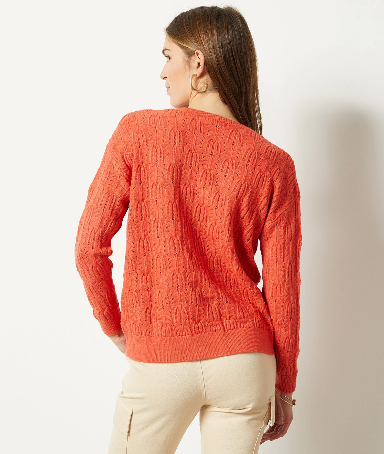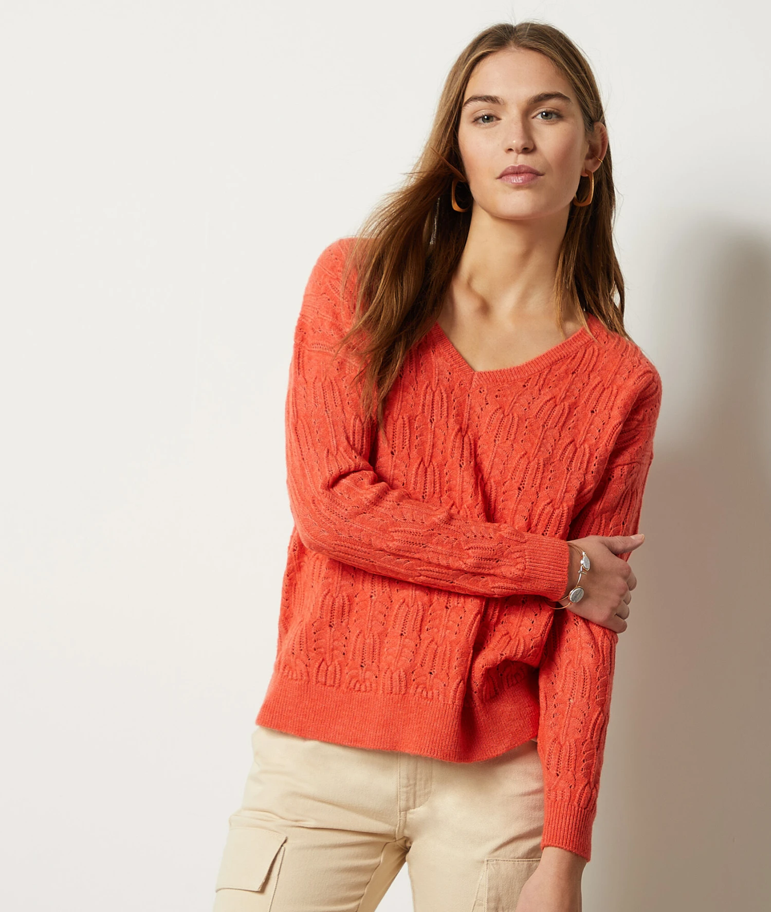 Un pull à col V et manches longues en maille moelleuse, muni de détails ajourés aux allures d’été. La pièce idéale à enfiler pour les soirées fraiches de la mi-saison.