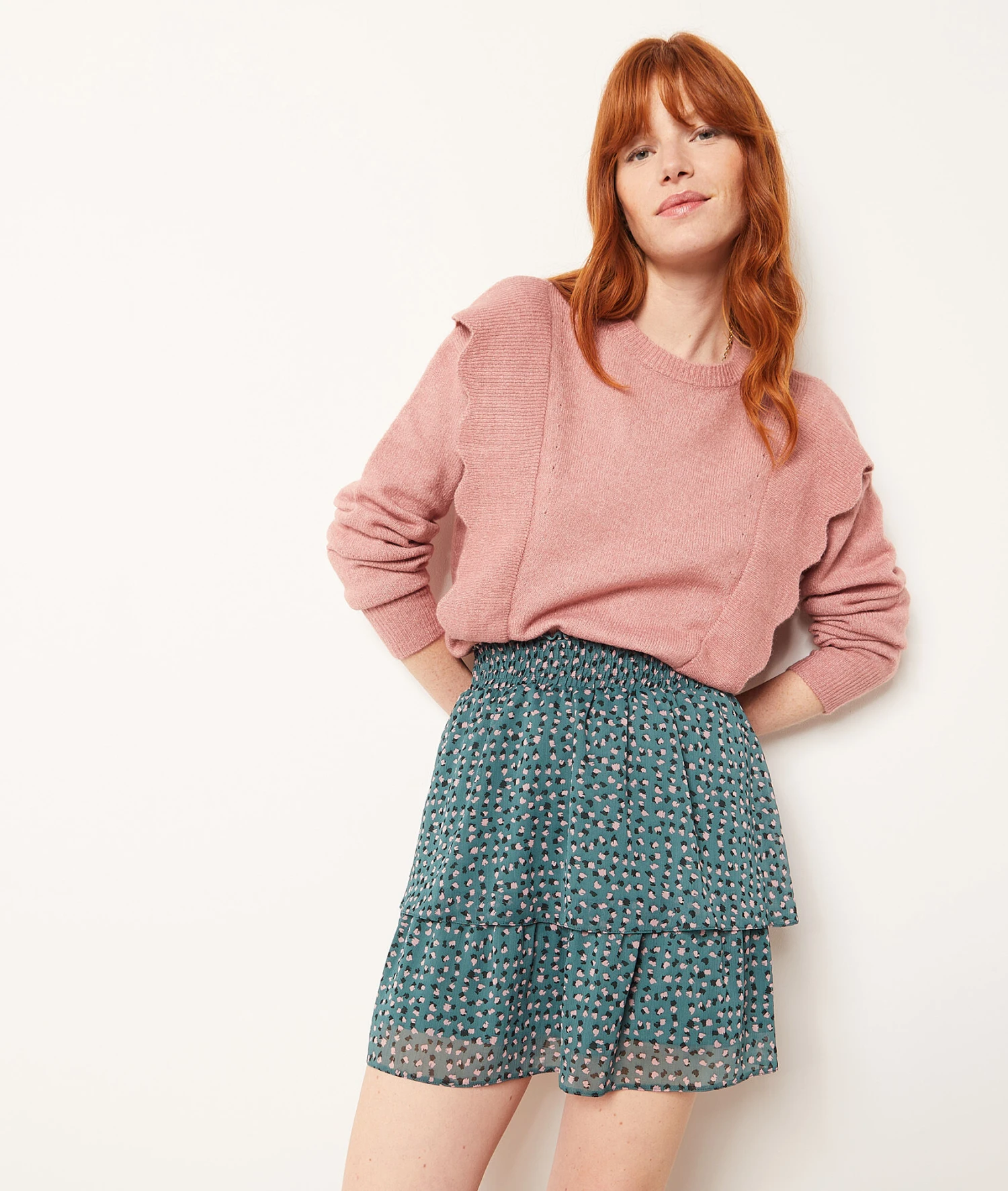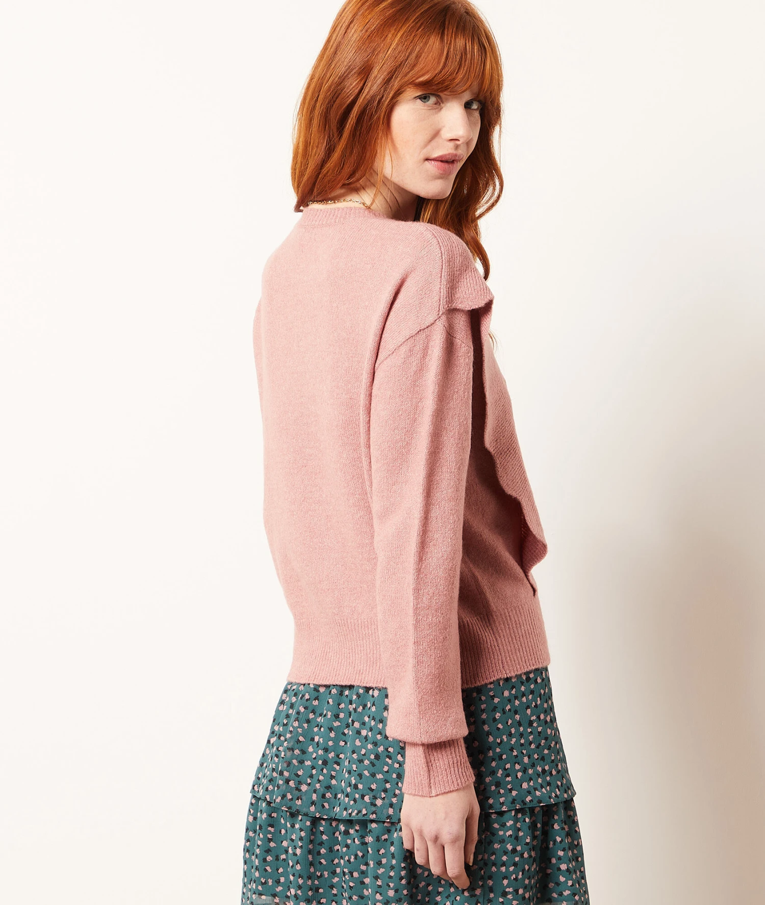 Muni d’un col rond et de manches longues, ce pull en maille joue sur les volumes avec des volants dévoilés sur les côtés. Il s’associe avec un jean pour un look décontracté ou avec une jupe pour un look romantique.