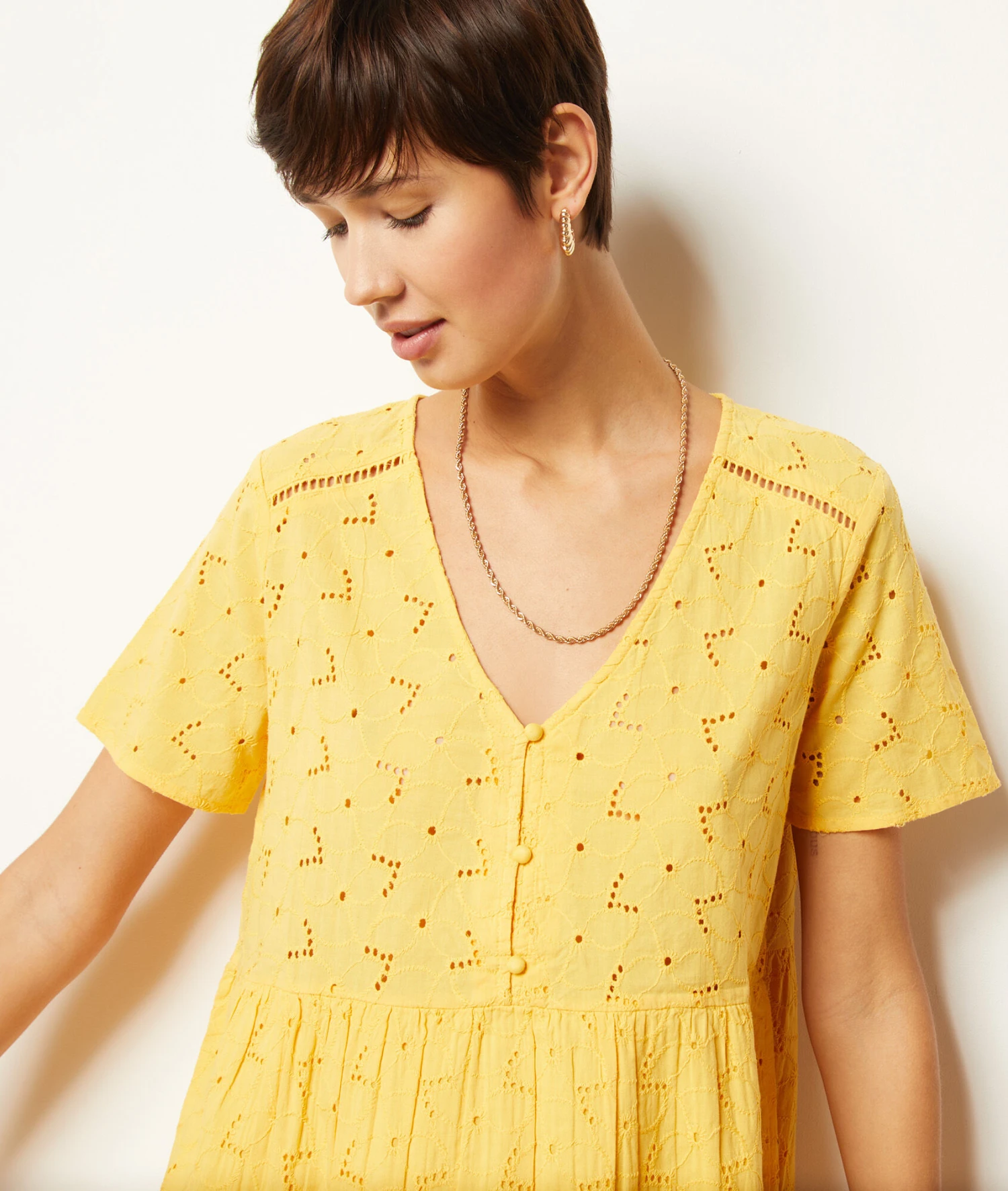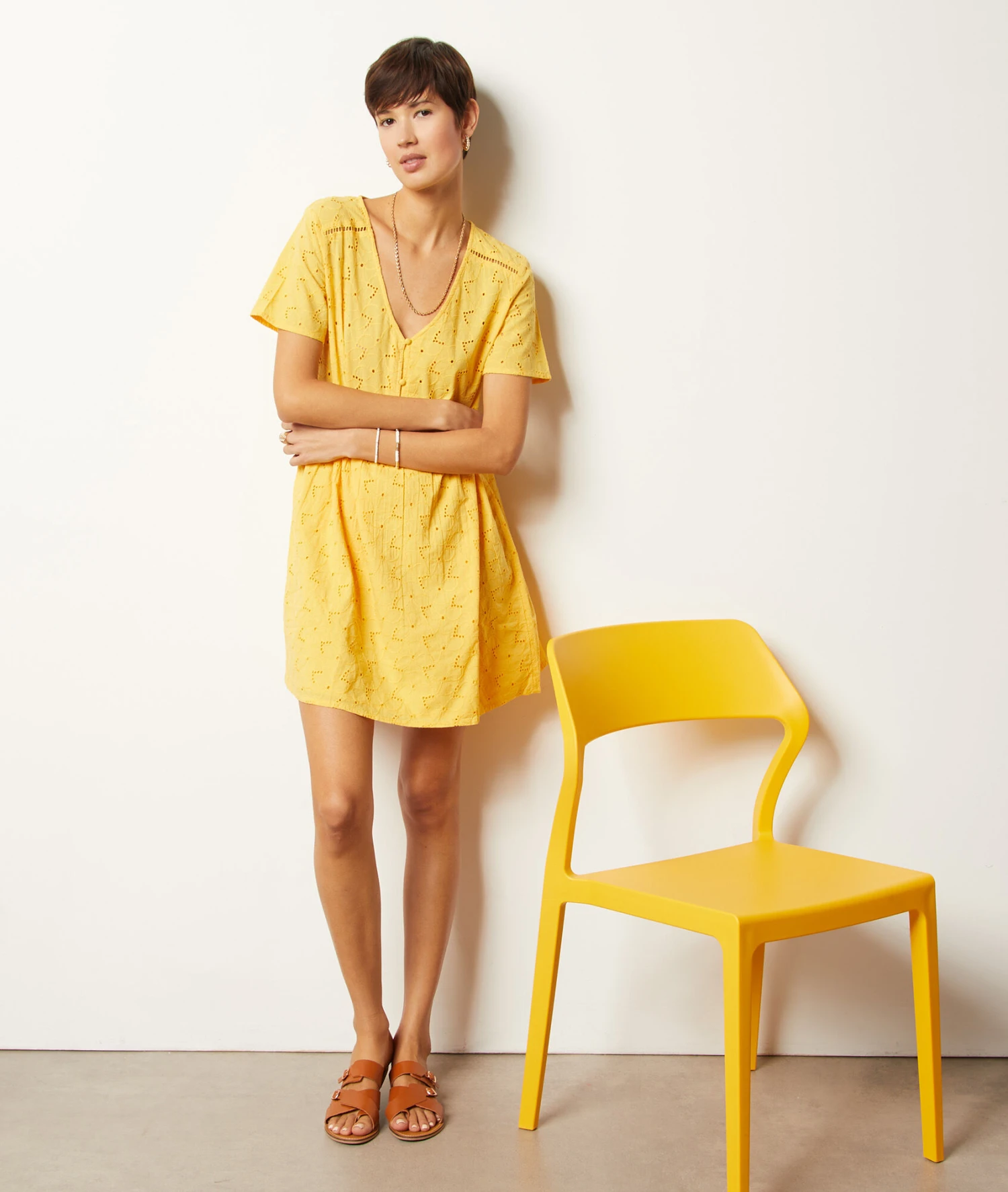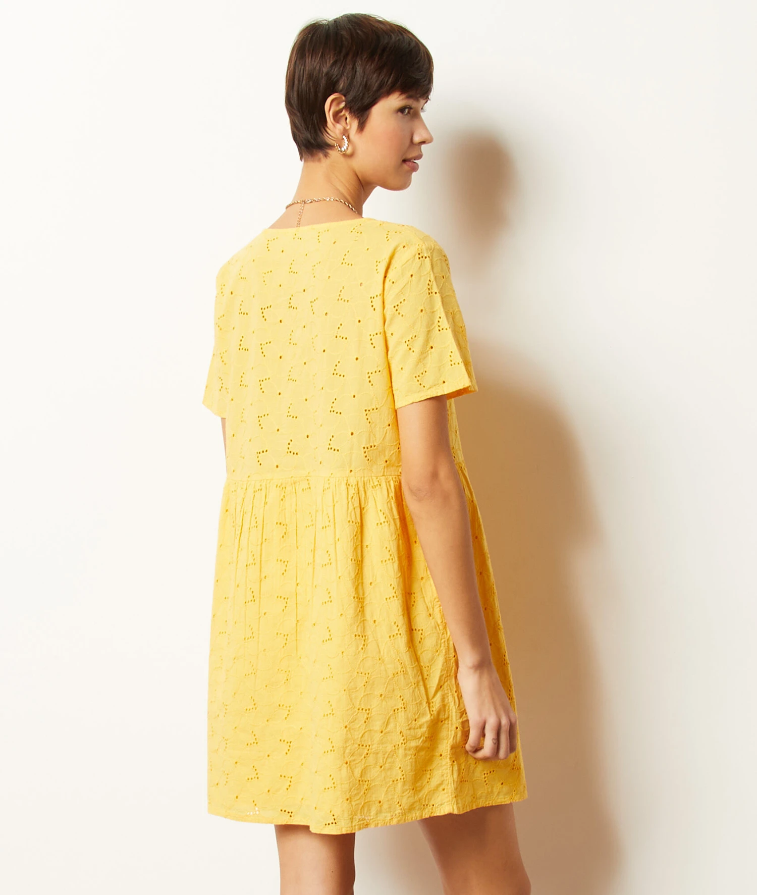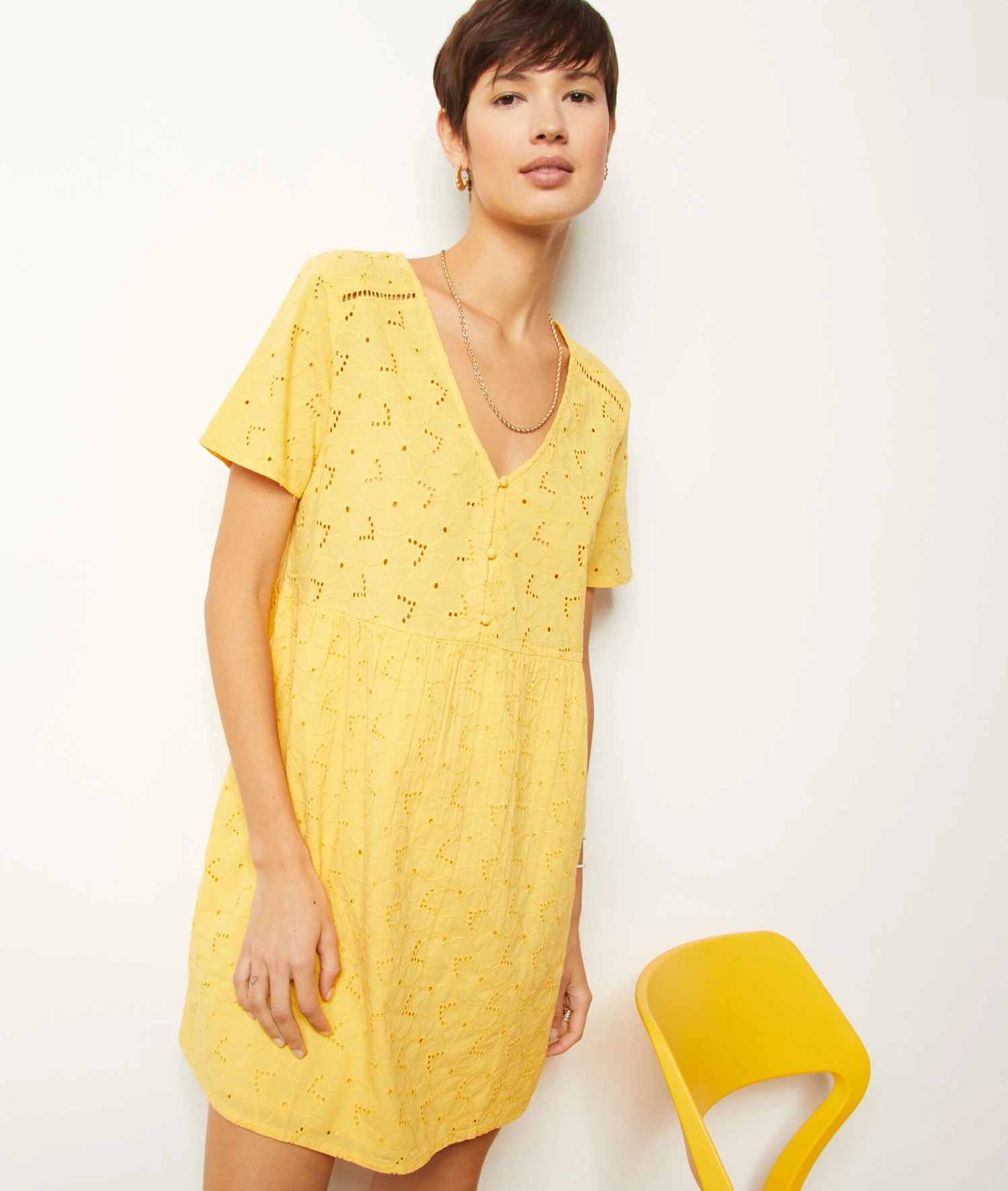 L’été sera ensoleillé. Le studio Etam a imaginé une robe courte jaune citron aux inspirations romantiques. Elle est ornée de broderies anglaises délicatement ajourées, dévoilant un peu plus la peau. Munie d’une encolure en V, de manches courtes et d’un bas de jupe volanté, elle promet des looks acidulés pour l’arrivée de l’été.