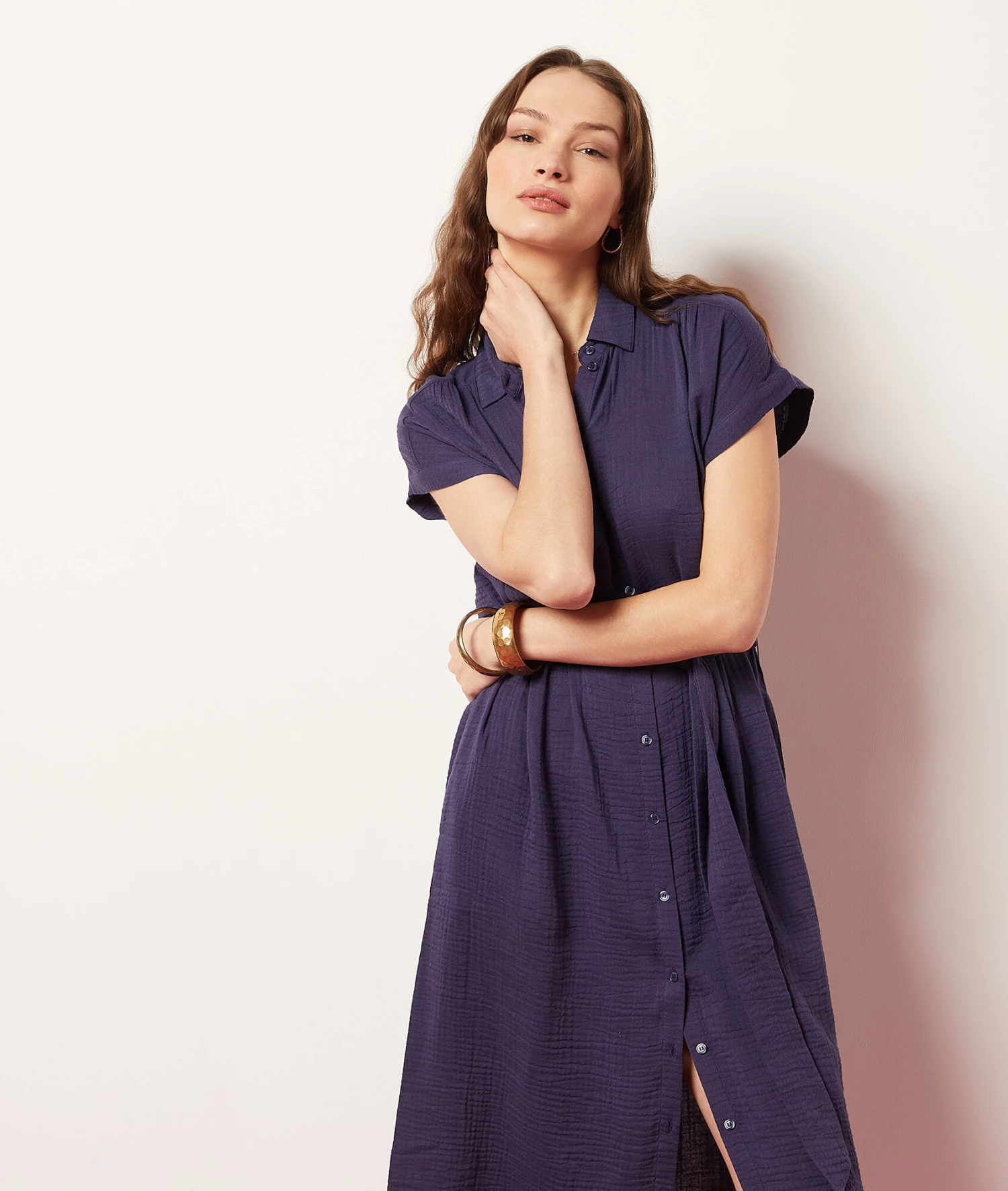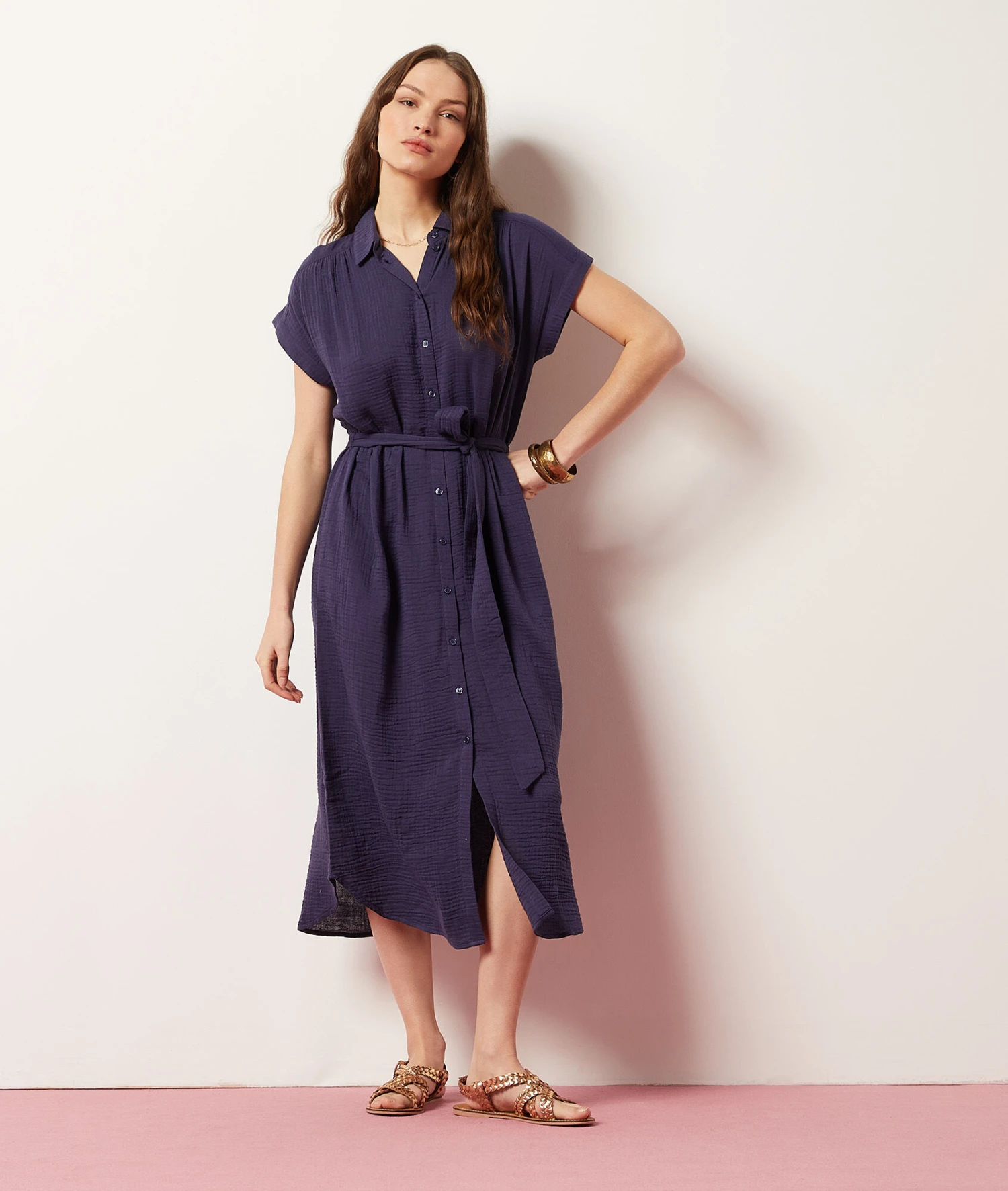 Un véritable essentiel de l’été : laissez-vous séduire par cette robe longue et fluide en gaze de coton. Munie d’un col chemisier et de manches longues, elle se porte aussi bien avec des baskets qu’avec des bottines pour un look décontracté chic.