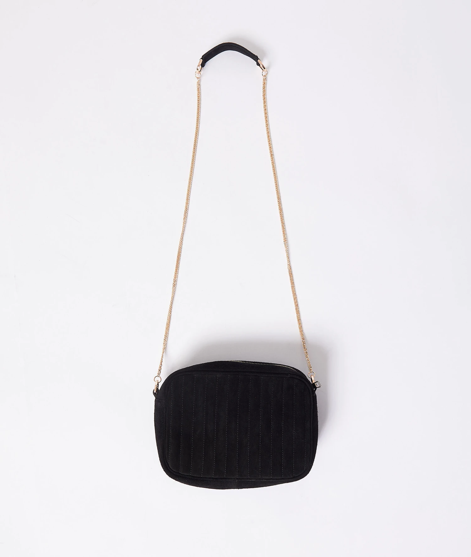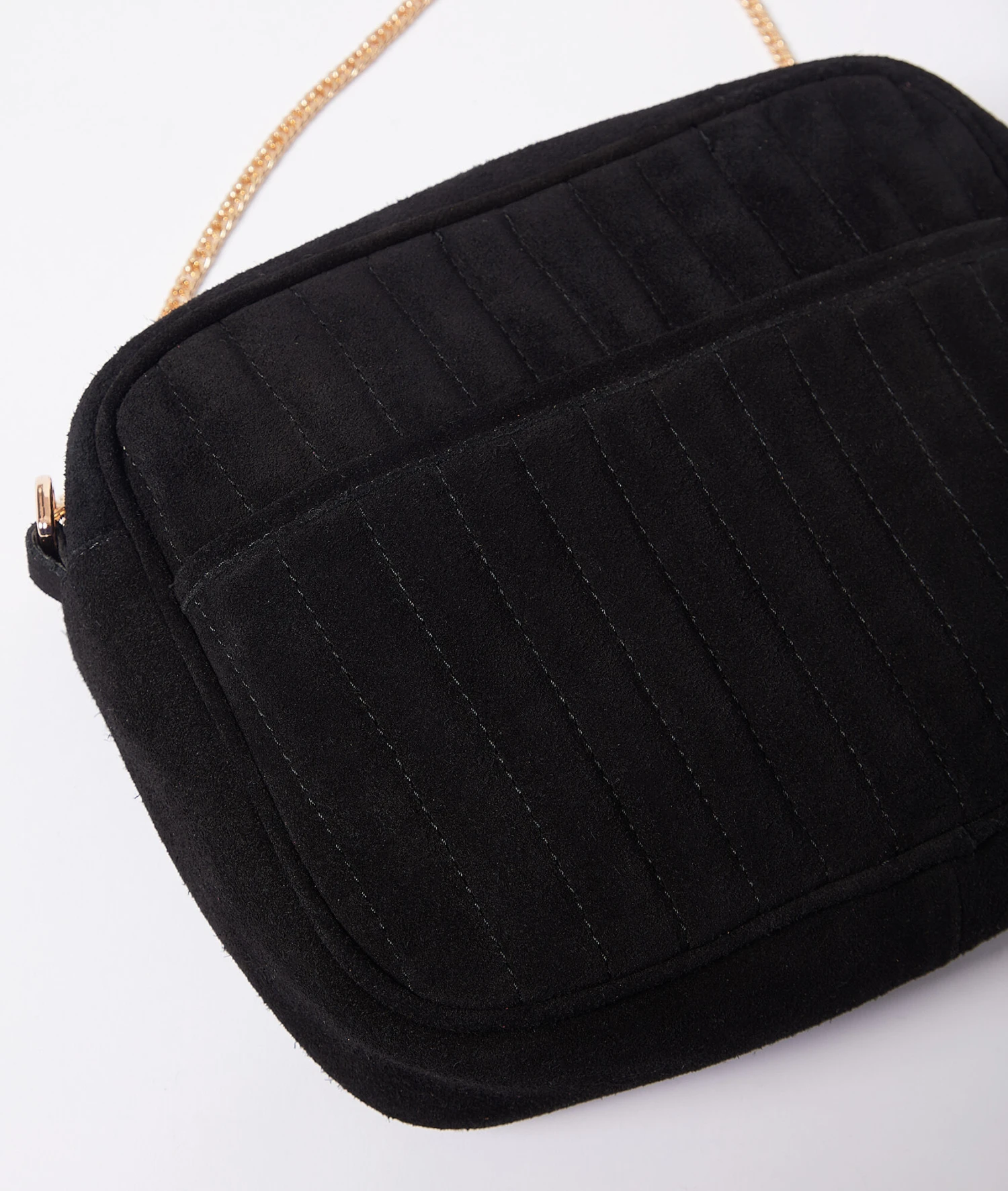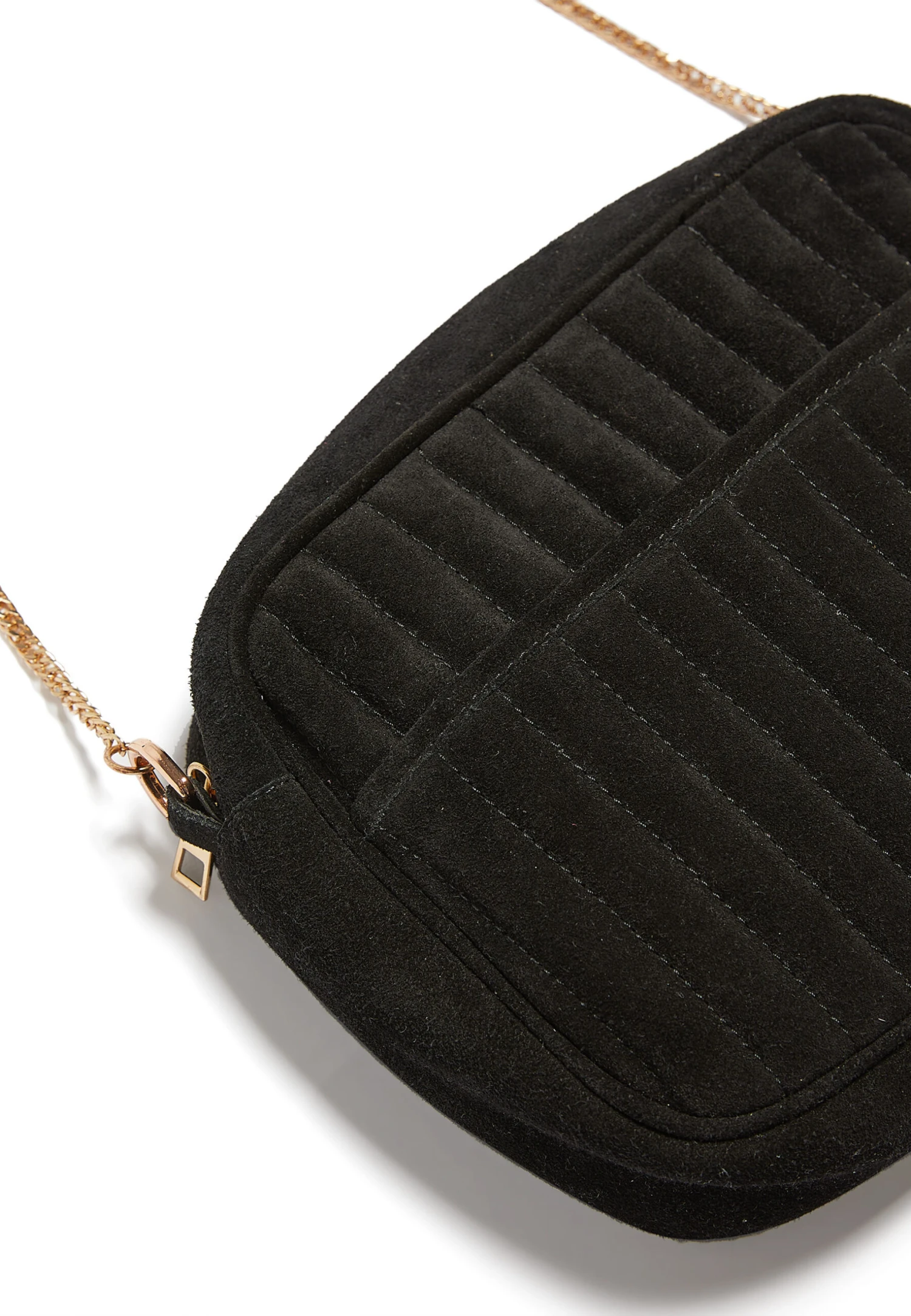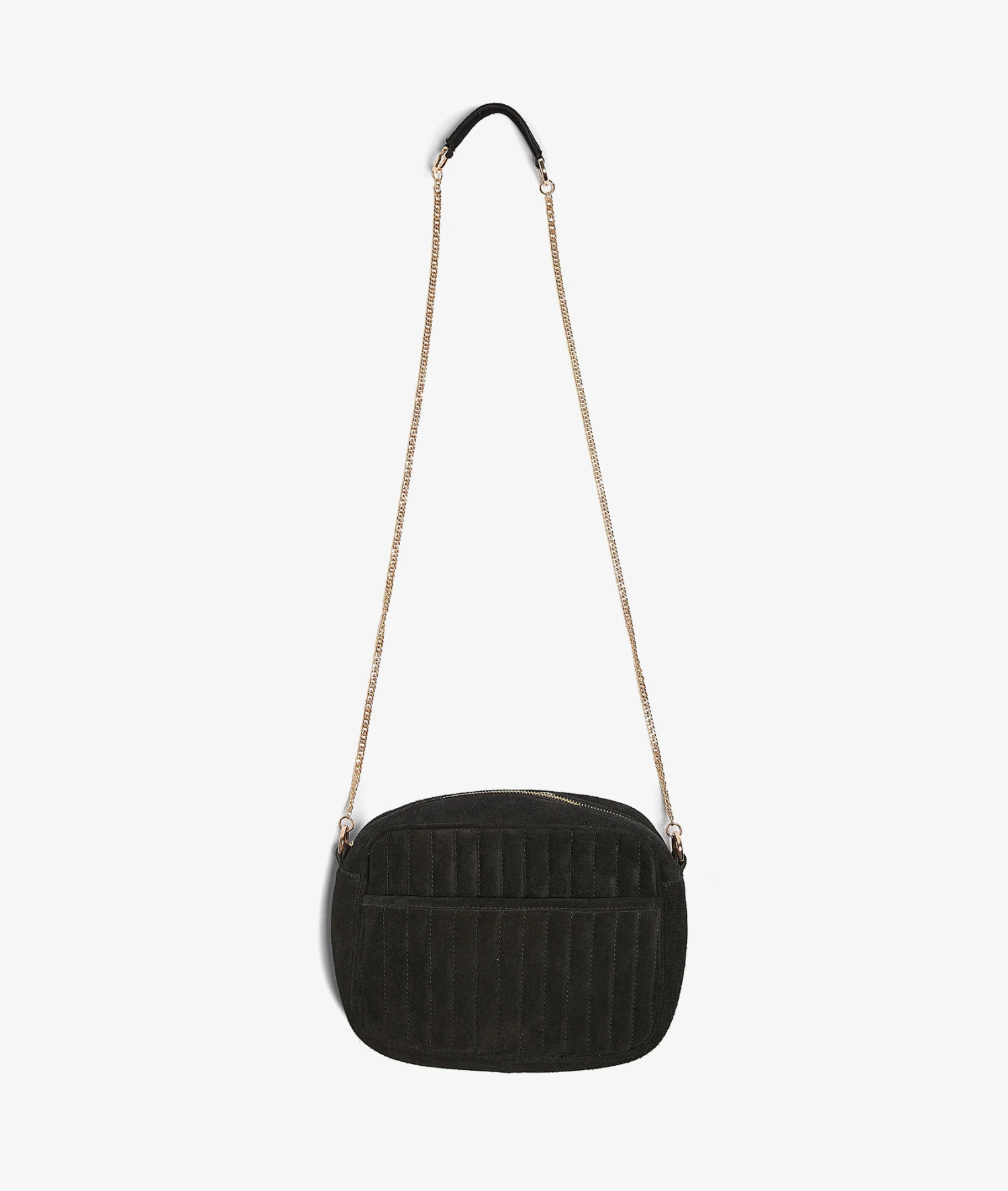 Un format ultra pratique et un joli cuir suédé : ce sac matelassé est le coup de cœur de la saison. Muni d’une fermeture zippée et d’une bandoulière chaine à renfort de cuir, il se porte à l’épaule ou en crossbody.
