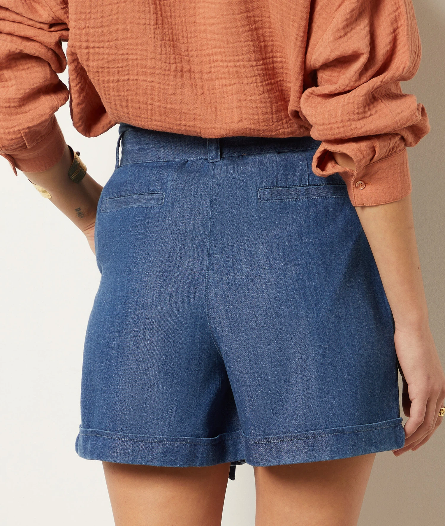 Le short en denim est revisité avec une matière fluide et légère, idéale pour l’arrivée des beaux jours. En coton, il est muni d’un nœud en guise de fermeture.