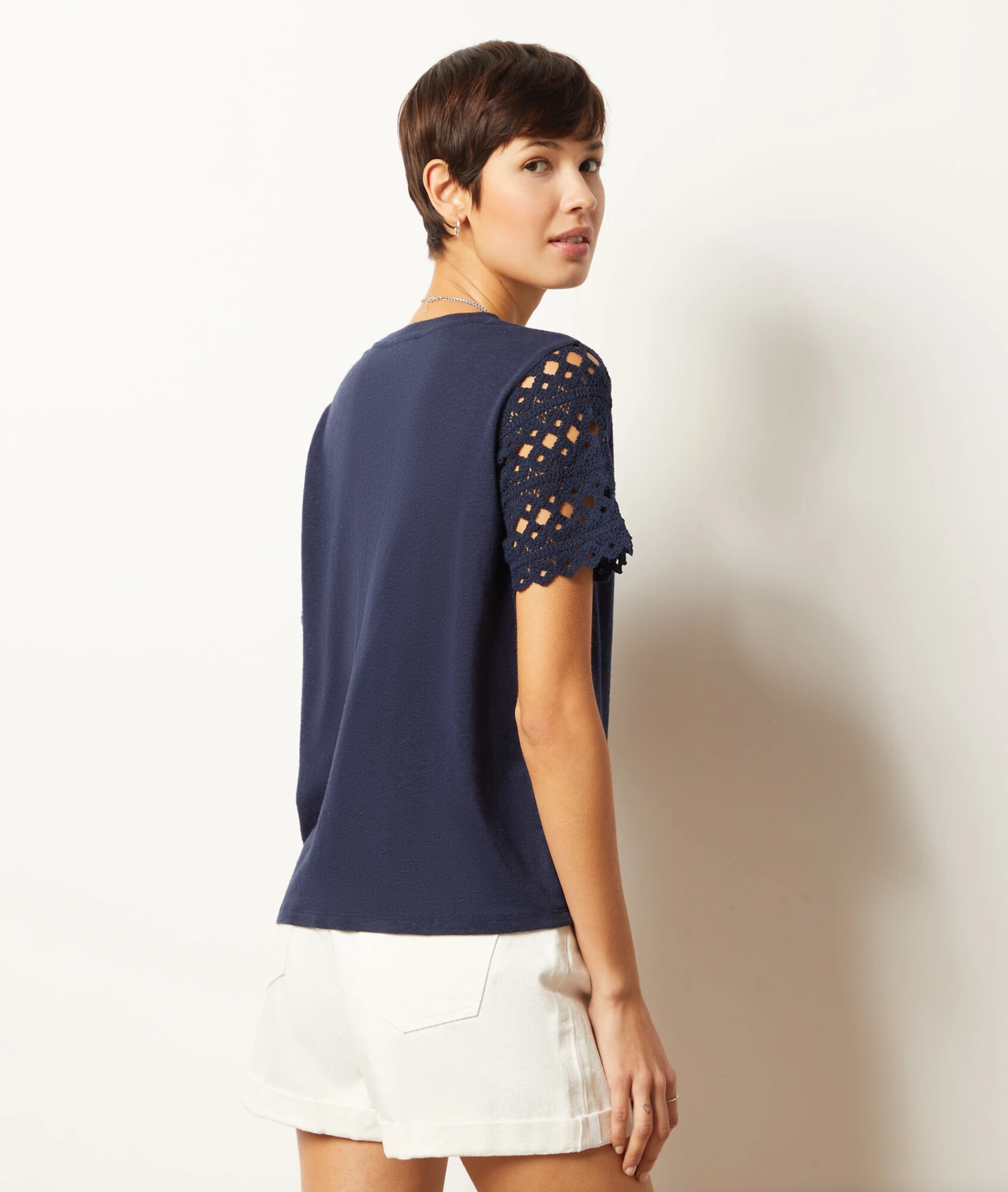 Cette saison, Etam revisite les incontournables du vestiaire estival avec des détails raffinés et des mix de matières tendances. Ce top en coton et lin mélangé à col rond dévoile des manches courtes en crochet. La pièce idéale à associer avec un jean pour un style casual ou à une jupe structurée lors vos évènements.
