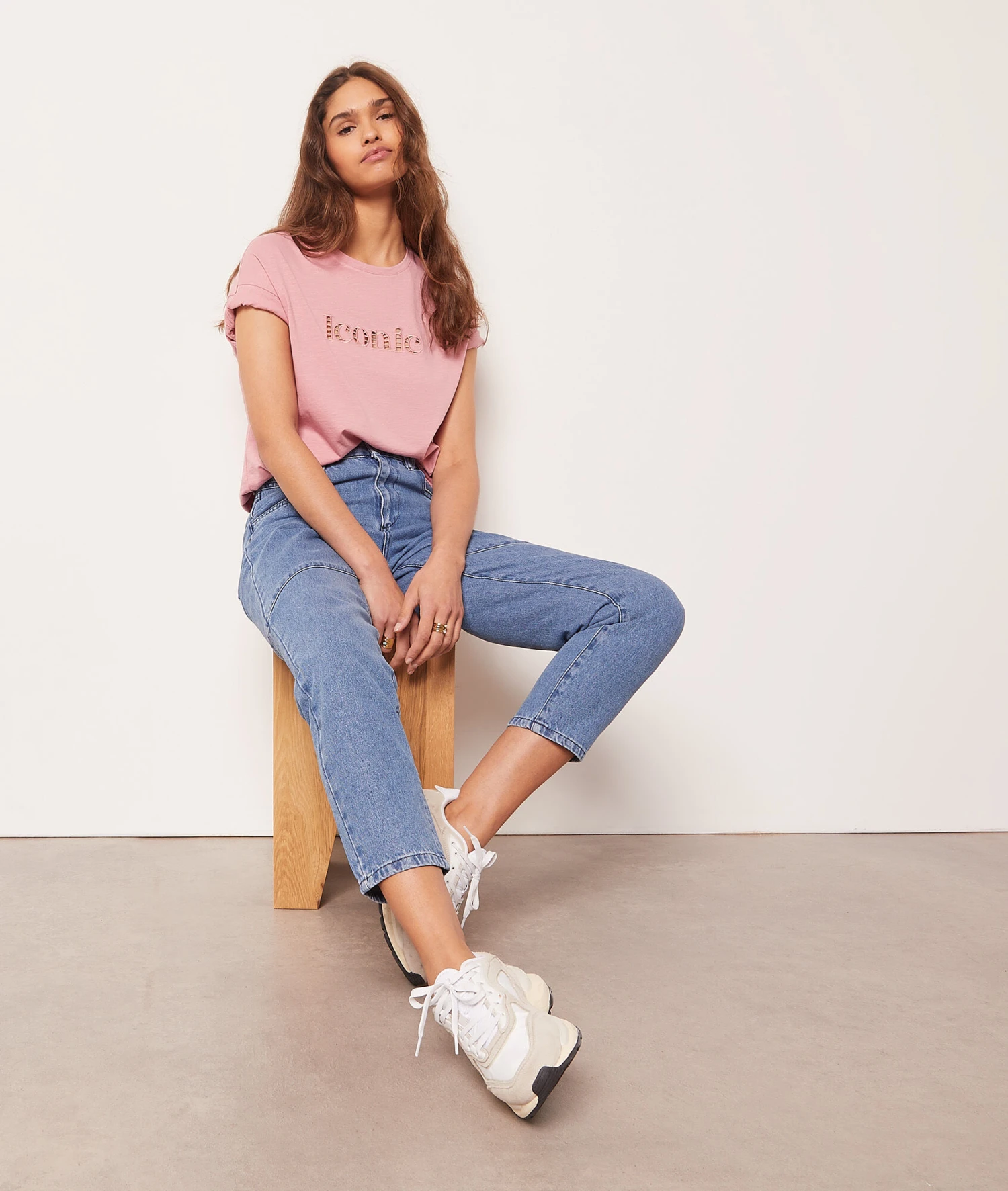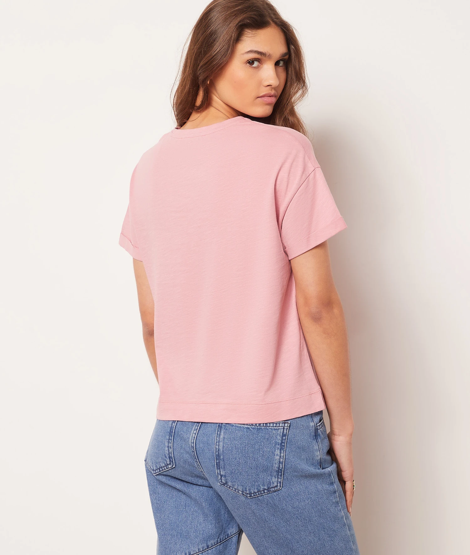 Un mantra feel good laisse apparaître la peau sous ce t-shirt en coton à col rond et manches courtes.