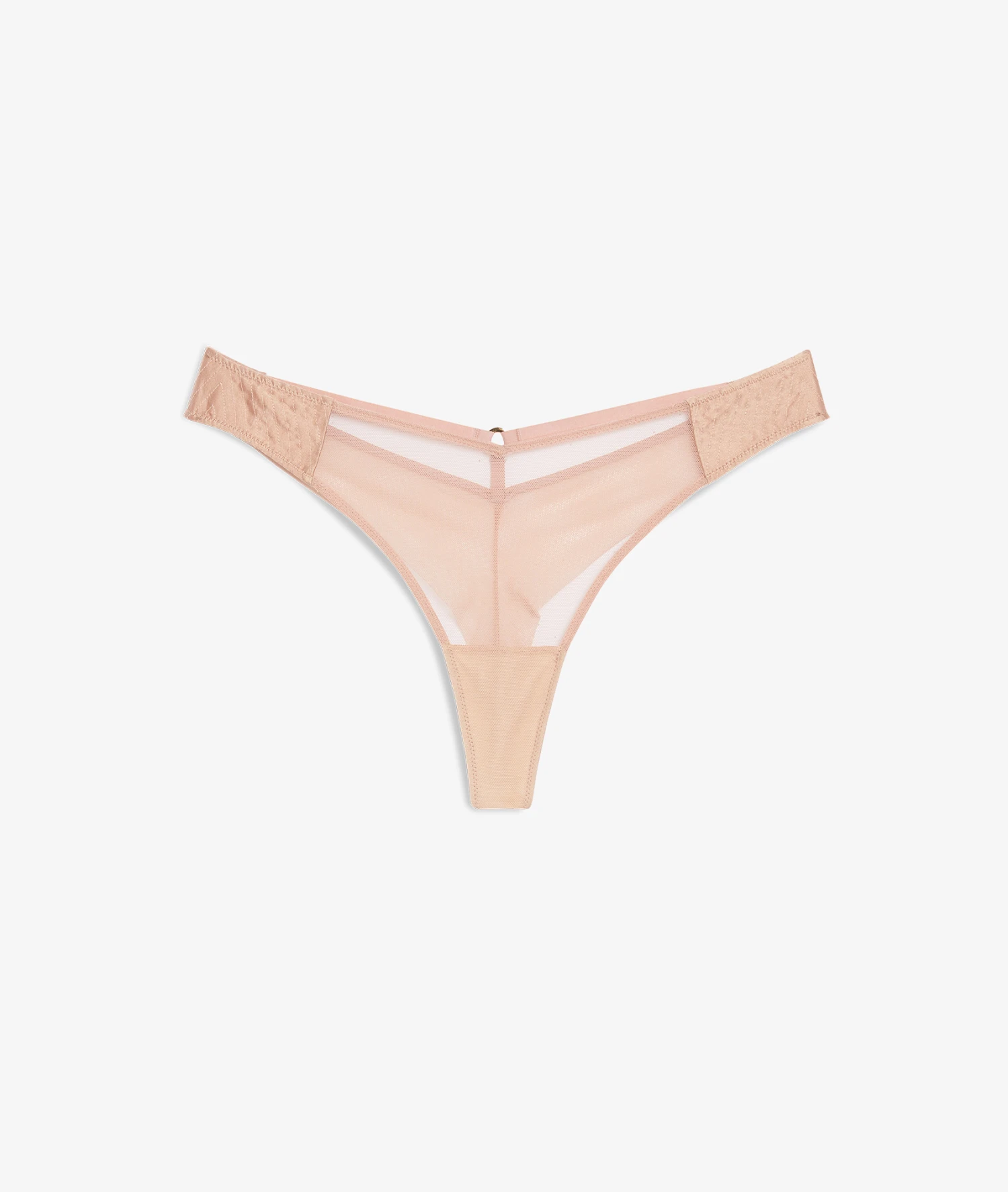 Une collection privée de haute lingerie au chic effortless : entre tulle transparent et soie précieuse, les courbes se dévoilent avec délicatesse, subliment le corps et exaltent l’esprit. Midnight : La rencontre inédite entre savoir-faire et modernité.Ultra sensuel, le tulle et la soie s’associent en toute délicatesse et nous surprennent avec un dos sexy. • Tanga• Tulle et soie• Dos travaillé• Anneau doré
