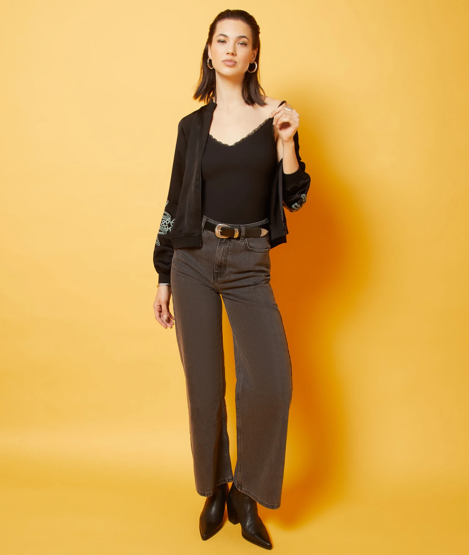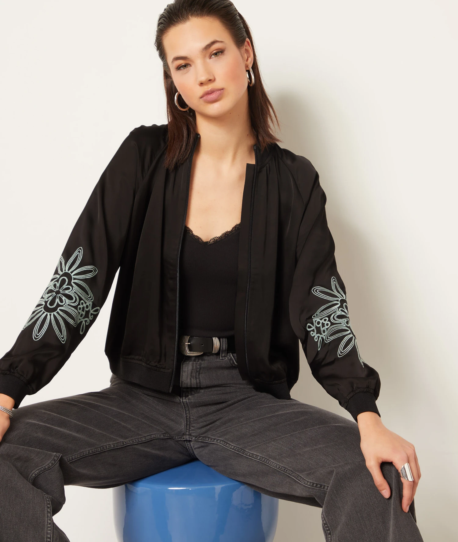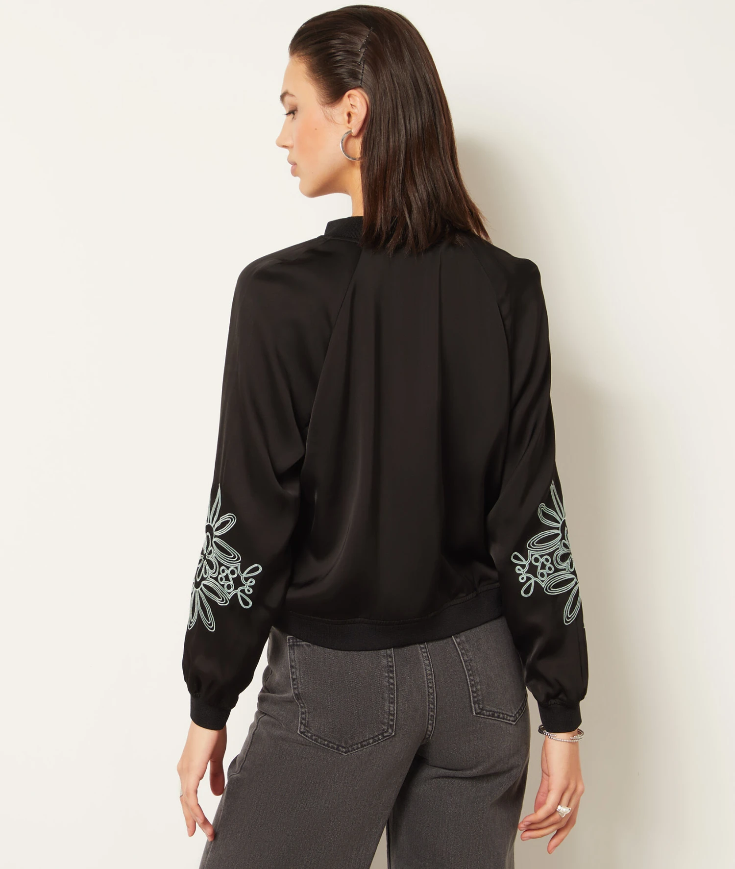 Revisité en version satinée, ce bomber brillant est orné de détails brodé aux coudes. Muni d’une fermeture zippée et de manches longues, il dévoile un col, des poignets et une taille côtelé.